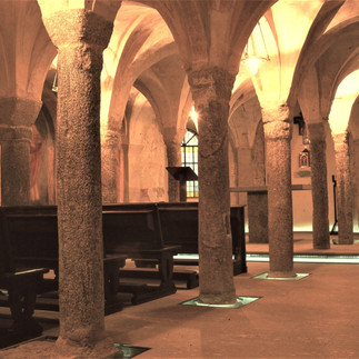 La cripta, come detto, da poco ottimamente restaurata, con colonne monolitiche in pietra, collarino e abaco tronco-piramidale, sul quale appoggiano o nascono le volte a crociera delle navatelle centrali e laterali. Nel nartece, sulle vele della volta, troviamo le Sinopie dei quattro Evangelisti con forma umana. Infine, dopo esserci issati nel sottotetto, in condizioni logistiche molto disagevoli e praticamente in assenza di luce, vi mostrerò alcune scene degli affreschi di notevolissima qualità che sporgono dalle volte e che in parte sono il completamento di quelli esistenti nella parte alta della chiesa sottostante. (Questo scrivevo parecchi anni fa, mentre nel 2014 si è fatto uno splendido lavoro per la fruizione degli stessi con una passarella sospesa sopra le volte seicentesche e adeguata illuminazione. Recentissimamente anche nella Chiesa sottostante si è fatto un particolare impianto d'illuminazione per la lettura degli affreschi. Preciso che le mia fotografie sono state eseguite nella mia prima, disagevolissima visita, praticamente in ginocchio sopra le volte).